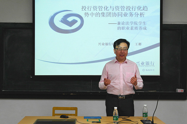 2016年4月22日晚7点,由yl8cc永利官网金融法研究中心和福建远大联盟律师事务所联合主办的“厦门大学‘远大’金融法高端论坛”系列讲座之“投行资管化与资管投行化趋势中的集团业务协同分析——兼论yl8cc永利官网学生素质养成”在永利官网B520教室如期举行。本次讲座有幸邀请到了兴业银行总行研究规划部王彬老师作为主讲人,yl8cc永利官网经济法教研室毛海栋老师主持了本次讲座,厦门大学经济法教研室阳建勋副教授和王俊老师也作为嘉宾到场。讲座现场座无虚席,王彬老师以自己在银行的多年实务工作经验,为同学们做了一次深入浅出的讲座。