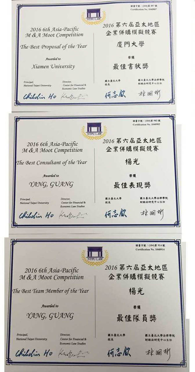2016年3月23日至3月25日,厦门大学法学刘永光副教授带领永利官网同学杨光、陈立锐、吴珊虹,管理学院郭军、陈代君以及经济学院李洋共六名同学赴台北大学大学参加“第六届亚太地区企业并购模拟竞赛”。本届并购汇聚了12所知名大学的优秀学子,分别来自:北京大学、清华大学、中国人民大学、南京大学、上海交通大学、厦门大学、香港大学、台湾大学、台湾政治大学、台北大学、新加坡国立大学、新加坡管理大学。这是厦门大学第二次参与该比赛。