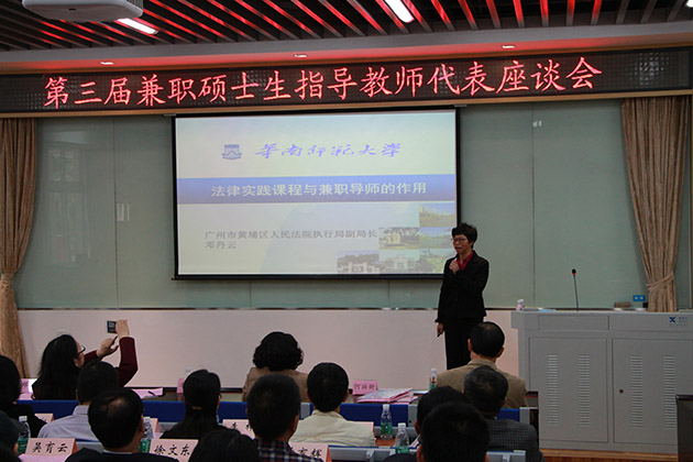 随后,由邓丹云法官作关于法律实践课程与兼职导师作用的讲座。邓丹云法官结合自己的亲身经历,以华南师范大学的实践情况为主要对象,全面地介绍了兼职导师参与华南师范大学法学院实践教学的方式手段及效果影响。开设模拟法庭、法律诊所、律师制度与实务等课程,以及建立华师法律实践教学中心微信平台,充分发挥了兼职导师对学生培养及成才的作用,在导师与学生之间建立了良好的互动关系,推动了学生的实践素养及水平大幅提升。