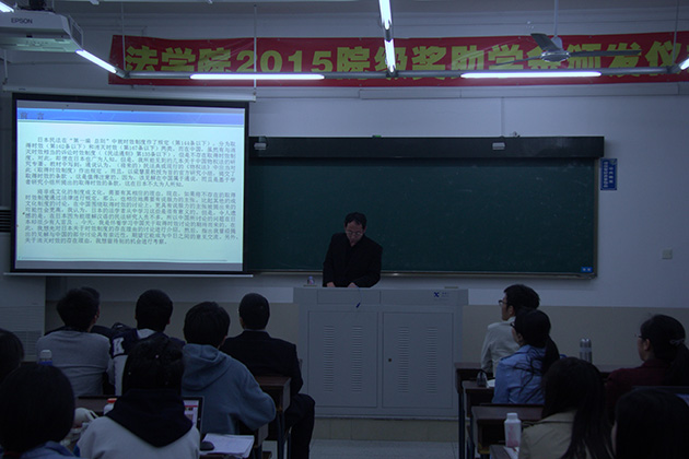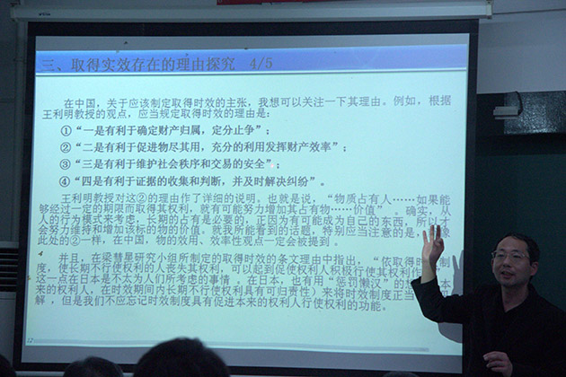 2015年11月27日星期五yl8cc永利官网A201教室,日本北九州市立大学法学部法律科教授、华东政法大学日本法研究中心兼职研究员矢泽久纯先生带来了“取得时效制度的存在理由”主题讲座。徐国栋教授担任讲座的主持人兼评议人,刘永光副教授担任现场翻译,来自各年级的学生们共同聆听了本次讲座。